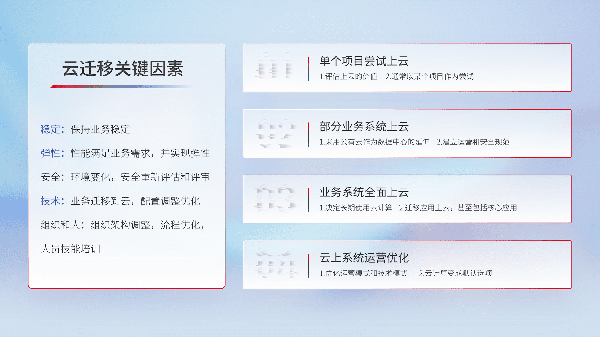结合实际业务,,从规划设计、、云平台选型、、、云原生改造、、数据迁移、、集成交付,,迁移全过程为客户识别最佳上云路径,,,做好风险识别管理,,,,设计网络架构、、、身份权限、、、安全审计合规、、操作审计、、、、日志审计、、监控告警策略、、、多站点容灾设计等,,,对云上基础设施进行整体规划,,,,提升IT治理水平,,,,以满足弹性、、、高可用、、高性能的需求。。。