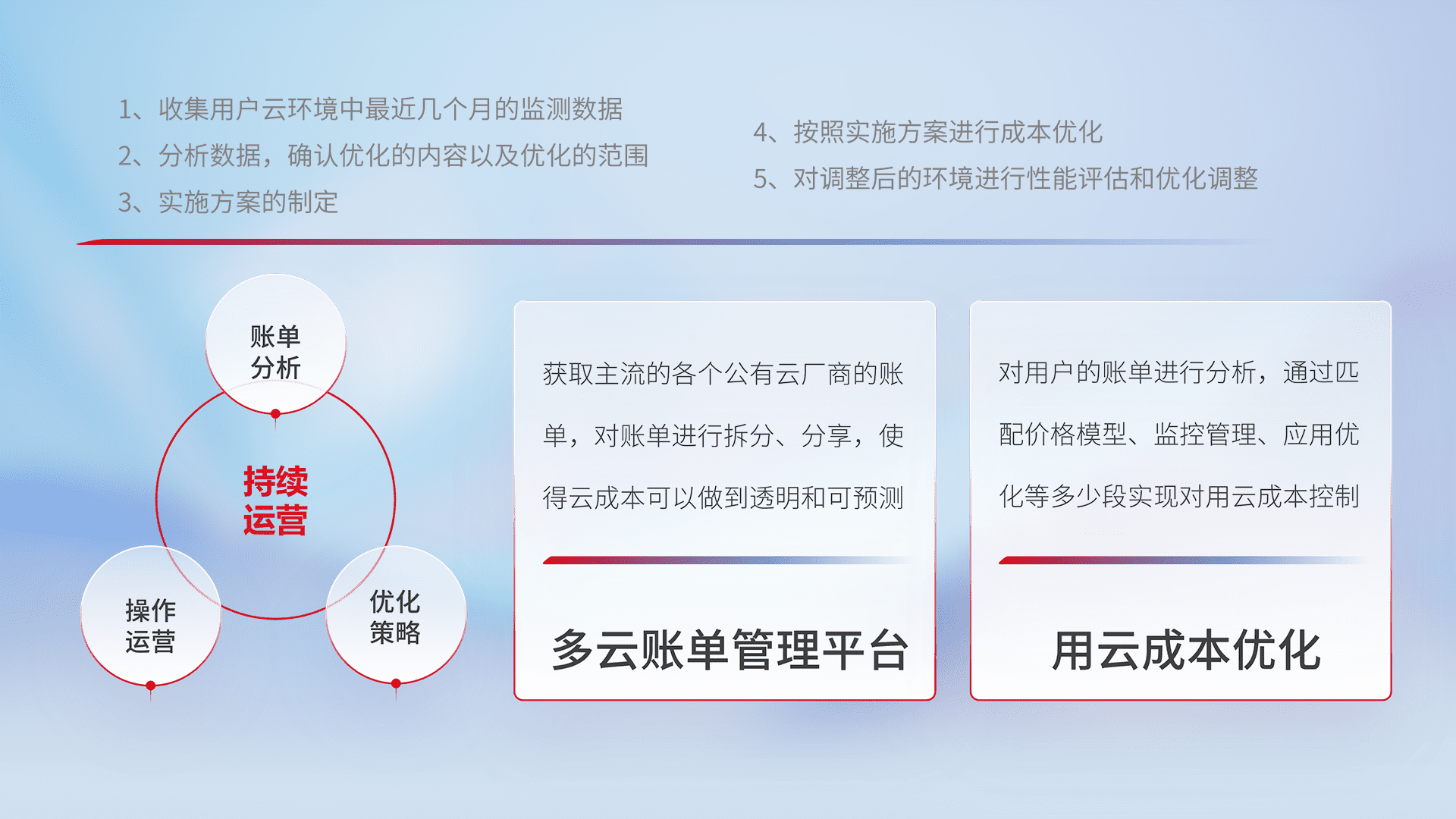 通过多云纳管,,以统一的资源数据模型把客户的云资源进行抽象和封装,,进而实现对多云资源的统一操作,,,保障云资源管理的可靠性、、、、稳定性与可用性。。。量身定制化运维内容,,配置、、开发运维、、、补丁管理、、备份、、、监控、、、认证和访问管理、、、审计和日常巡检等,,,,保障在用云过程中的可靠度,,稳定度以及高可用率。。